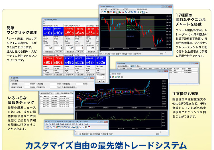 17種類のテクニカルチャートを搭載し、リアルタイムの為替レートから簡単ワンクリック発注が可能!