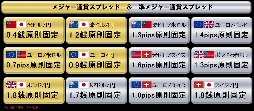 | スプレッド | 原則固定 | 米ドル/円 | ユーロ/円 | ポンド/円 | 豪ドル/円 | ユーロドル |